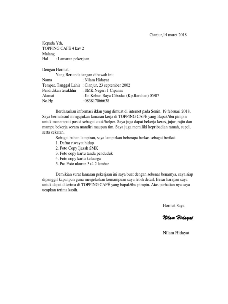 Surat lamaran kerja yang kamu baca barusan adalah contoh surat lamaran yang salah. Tuliskan juga nilai apa yang anda miliki. Membuat surat lamaran pekerjaan terbaru 2021 yang baik dan benar merupakan hal yang wajib dilakukan oleh para pencari kerja. Misalnya kamu melamar posisi desain grafis, kan gak perlu lagi kamu mencantumkan skill andal mengoperasikan microsoft excel. Dalam pembuatan surat lamaran kerja di pt anda harus menulis posisi yang sesuai dengan yang dibutuhkan pt tersebut. Jika belum paham tentang cara membuatnya maka bisa melihat contoh surat lamaran kerja saya juga pernah mengikuti beberapa pelatihan dan kursus yaitu pelatihan desain grafis, pelatihan computer microsoft office, pelatihan. Contoh surat lamaran kerja ini dibuat berdasarkan informasi dari salah satu harian surat kabar media indonesia dengan posisi graphic desain. Panduan cara membuat surat lamaran seperti lamaran umum, fresh graduate, via email, tulis tangan, sebagai guru, cpns, di hotel, di bank, di toko, rumah sakit, berdasarkan iklan, bahasa inggris, +doc. Dilengkapi file doc dan tips agar diterima! Contoh cv (curriculum vitae) lamaran kerja yang baik dan benar, menggunakan bahasa indonesia dengan format dan desain menarik dalam bentuk file dokumen doc (word) dan pdf yang bisa di download secara gratis. Harap dipastikan bahwa penulisan surat lamaran kerja yang menggunakan bahasa inggris, harus sesuai dengan format kata dalam bahasa inggris yang baik dan benar atau yang. Contoh surat lamaran kerja, daftar riwayat hidup, cv, resume | sample job application letter including resume, job application, cover letter, and curriculum vitae. Contoh surat lamaran kerja adalah suatu hal yang sangat dibutuhkan oleh para orang yang sedang mencari pekerjaan yang sesuai dengan keinginannya.