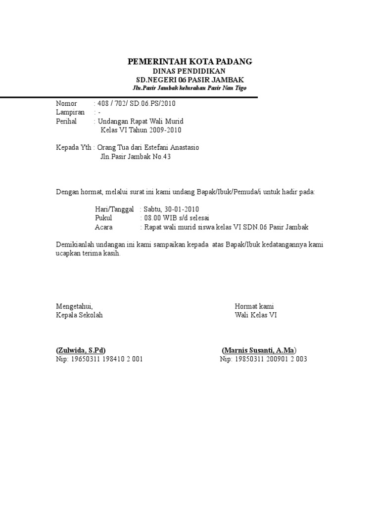 Pemerintah kabupaten situbondo dinas pendidikan sd kartini indah jl contoh surat resmi sekolah sd. Contoh surat undangan pengambilan raport untuk wali murid.